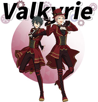 2、Valkyrie隶属公司:COS.MIC PRODUCTION“编织艺术的博物馆。A museum of art interwoven.”由斋宫宗带领的高格调造型艺术派组成。有着独具一格世界观,和粉丝之间保持着一定疏离感,精英团队总体富有个性化。新闻媒体曝光层面以谈话类节目的嘉宾,造型艺术综艺节目讲解,电影与戏剧表演等能够发挥艺术大师特征的工作中为主导。主题色是酒红。斋宫宗CV:高橋広樹影片美伽CV:大須賀純