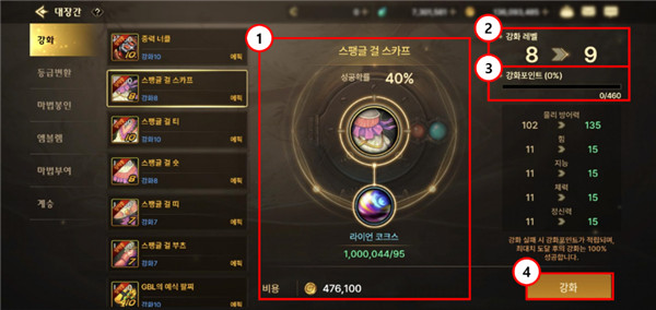 4、加强越高,所需要的较大加强量也会跟着增长,具有提高加强概率的物件金属催化剂,适用满足条件的武器升级。