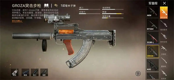 整体性能最强大的近身武器,全方位辗压别的自动步枪输出,而且即使打远程控制都比AKM和M762后座力低,这就使得Groza变成AKM和M762遇上必换武器平时用【排麦】语音和同伴组队这个人是大神教会了我如何使用。但唯一缺点是腰射蔓延非常大,如果你不想腿抽筋也是需要练一练开倍镜拉枪提升限制。