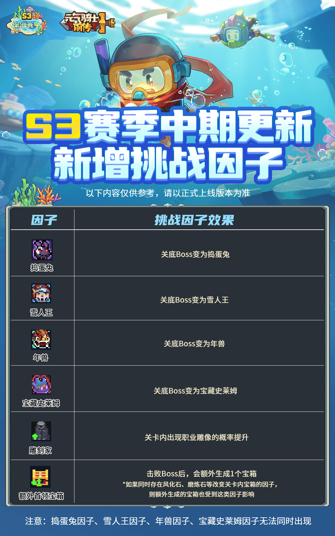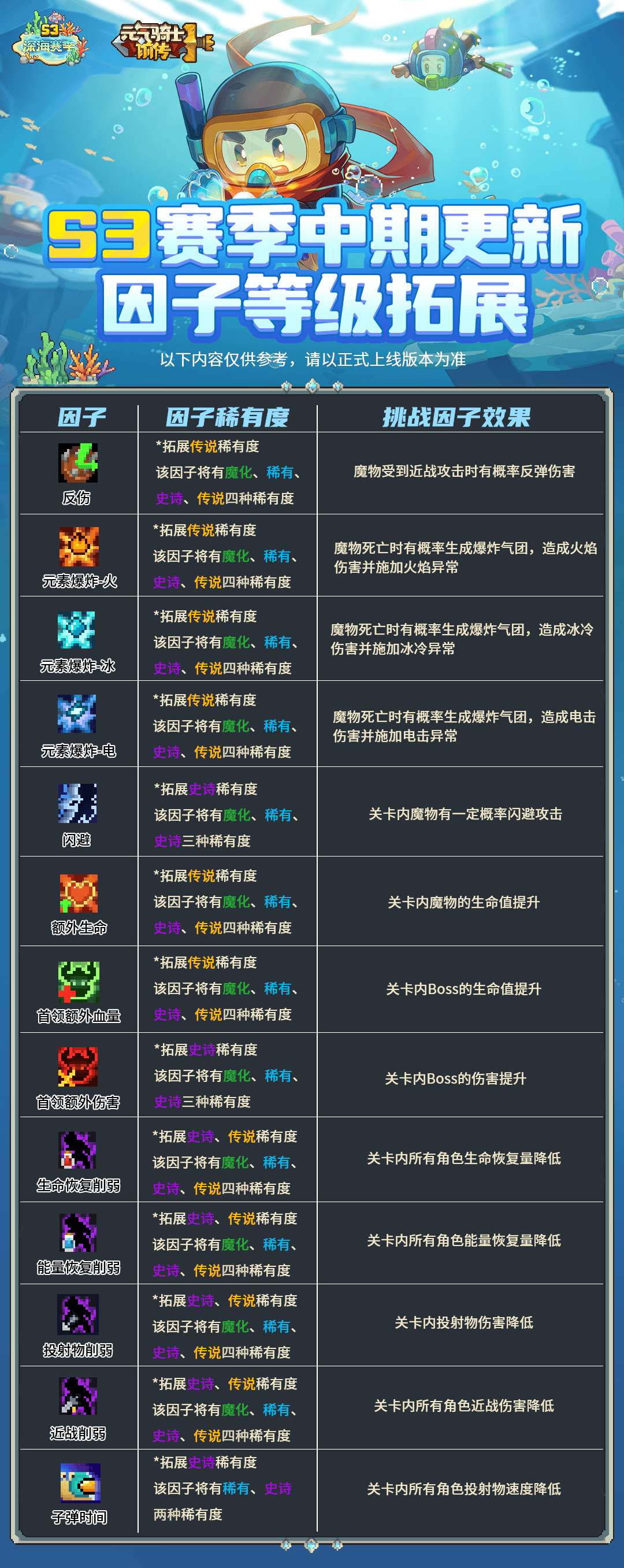 在S3赛季中期系统重装后我们将要在游戏内新增加一批挑战因子,新增加因素如下所示: