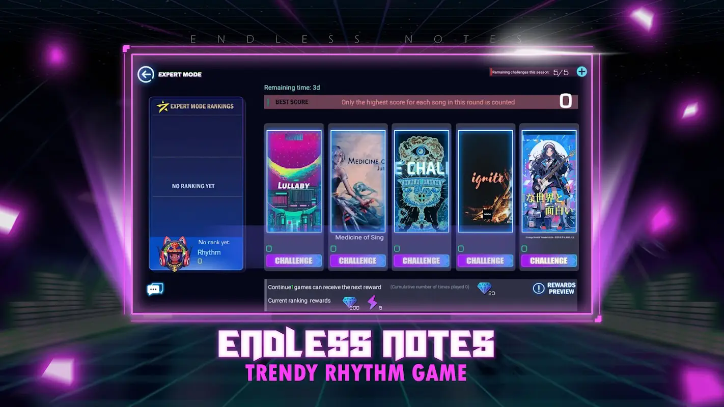 不休的音符是一款能够任意选择歌曲挑战的游戏,在不同关卡中可以将其入门冲关玩游戏,跟随趣味性好玩儿的节奏感方式,在每一关外都能够快速挑战,并且都是官方正版音乐能够挑战,不一样最流行的歌曲难度越大,钟爱音游的朋友们可以来免费下载这一款游戏,赶紧来试一试吧。