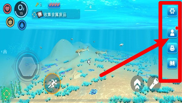 1.探索水域:在湛蓝深海中随意探索,玩家可以随时点击右侧菜单栏进到挎包、设定或人物角色信息内容页面,全方位操控生存情况。
