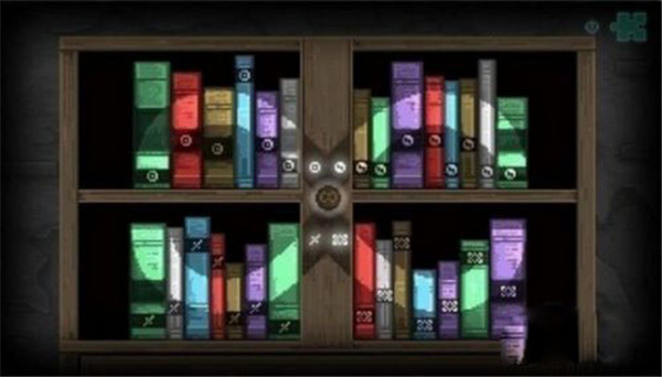 3、谜题三:书柜、提示硬币 1:先归类书本,再排序拼出某一样子,提示硬币 2:无内容,分析:易发现书本上四种标志与书脊异样,遇困可以调整显示器亮度;