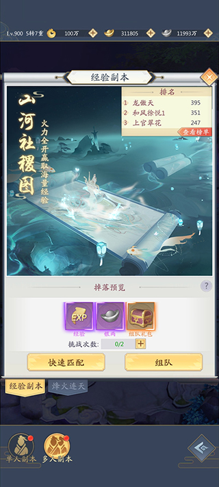A:山河社稷图为游戏里的工作经验团本,是游戏工作经验产出率最多的