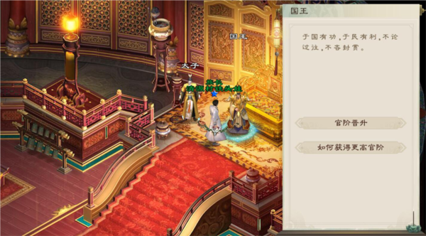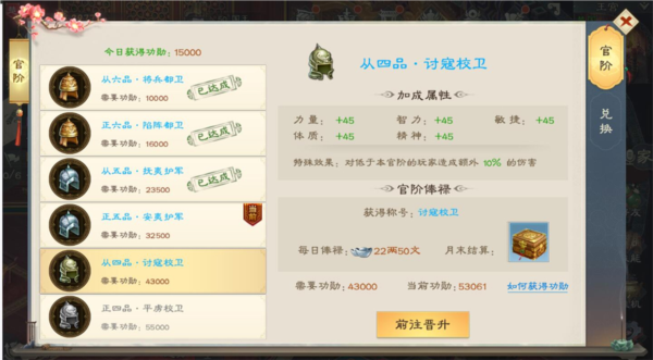 3、功勋值积淀达到下一级别官衔标准时,点一下【前去升职】,在君王处升职官阶,获更高一些属性、头衔与月俸;