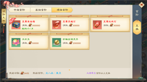 6、不一样官阶可以从功勋店铺换取不一样属性仙丹,官阶越大兑换的仙丹属性就越好;耗费功勋换取后若不够现阶段官衔规定,会触发官阶降权;