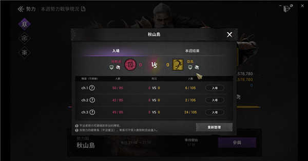 势力战每天早晨9号开始,连续10min。赛事分好几个频道栏目开展,每一个频道栏目容下最高为190人。玩家可自由选择频道栏目并进场,还可以在战场上转换频道栏目,但需等待比较长的技能冷却时间。前期最好是选择我方人数较多的频道栏目以增强获得胜利概率。势力战完成后,依据势力分数排名和输赢发放奖励,就算不成功也可以获得一定的BUFF与积分兑换。