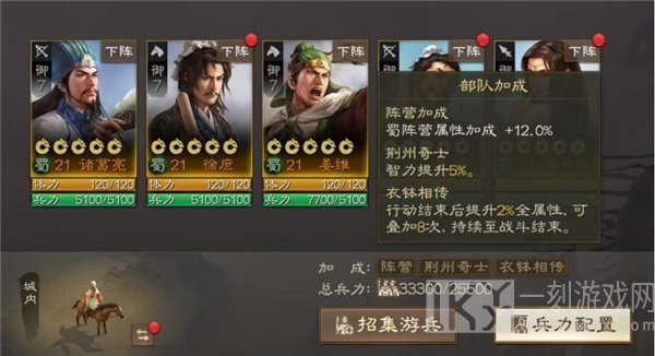 五人都是蜀汉阵营,与此同时出战得到12%的属性加持,诸葛亮、庞统、徐庶三人同队获得荆州市奇士的牵绊,智商提高5%,给诸葛亮产生导出加持,另外两位武将用黄月英和姜维开启衣钵相传牵绊,行为完成后提高2%全属性,可叠加八次,持续至战役结束。