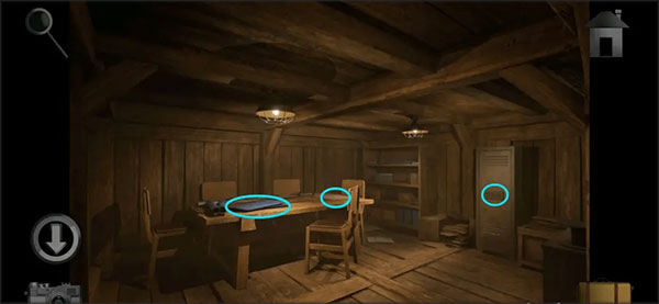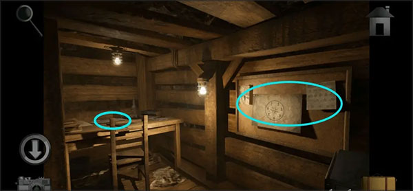 4、走进去进到公司办公室,观察桌子上的宏伟蓝图,随后根据上面的提示打开小木屋下边加锁的小盒子,结束后拿走盒子里的「锁匙」和「执手锁」。