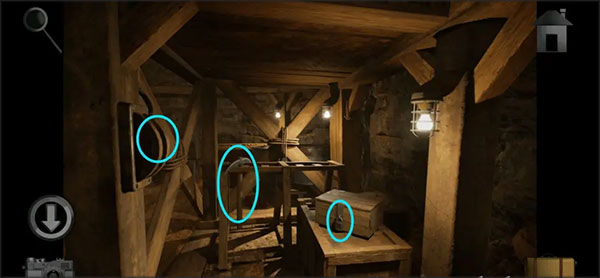 7、返回储物间用锁链将勾子和别墅地下室把手相连接,随后用锁固定不动铁链子,再旋转转盘冉冉升起地下室门。然后进到别墅地下室拿走小箱子里的「遥杆」,再记牢时钟的时间提示。