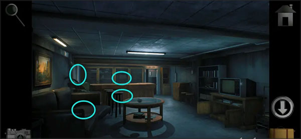 12、右侧桌子上深蓝色小箱子需要两个三位数登陆密码才可以打开,不管,先拿走电视下边柜子里的「飞刀」。然后掀起沙发坐垫,在下面有一个玩具盒用来放以前得到的物品格子,还要凑够其他几个。