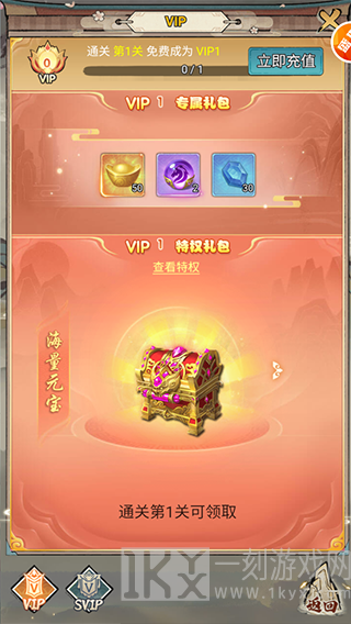 1、登陆游戏过关第1关,就可以领到一个vip1特权礼包