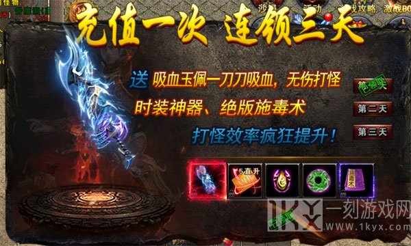 最先不得不说的便是游戏里面的首充,在线充值一次可以连领3天奖赏,第一天送饮血玉饰,免伤杀怪服装奇妙,稀有施毒。也有VIP升到5级卡,杀怪高效率玩命提升。第二第三天送顶尖剑招。摆脱手短,PK必不可少。砍怪如切土豆丝,打怪必不可少。让你领跑别的初学者玩家。