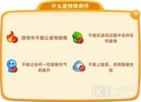独特标准就是指关卡的约束条件。若不能烧糊、不可以上错菜等,进入到关卡的时候会有特别提示(如下图)。一旦一不小心开启,便会判断闯关失败,大厨师要特别注意约束条件哦。