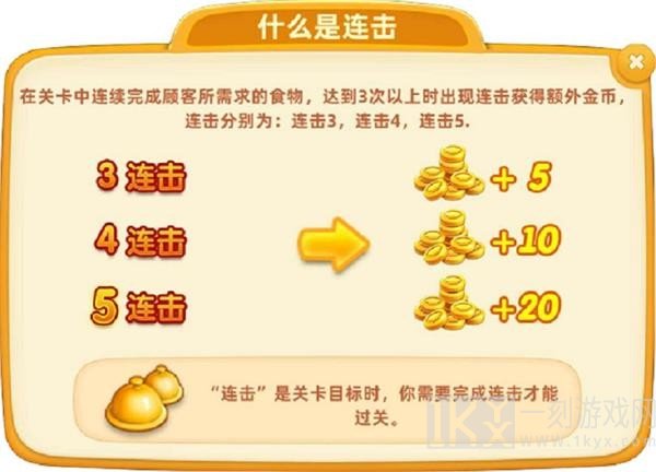 连击规定大厨师在关卡中接连进行顾客所需求的食材,持续上餐做到3次左右时发生连击同时可得到附加金币(2次及及以上的测算连击)。最大连击为5连击,可进一步增加20金币。
