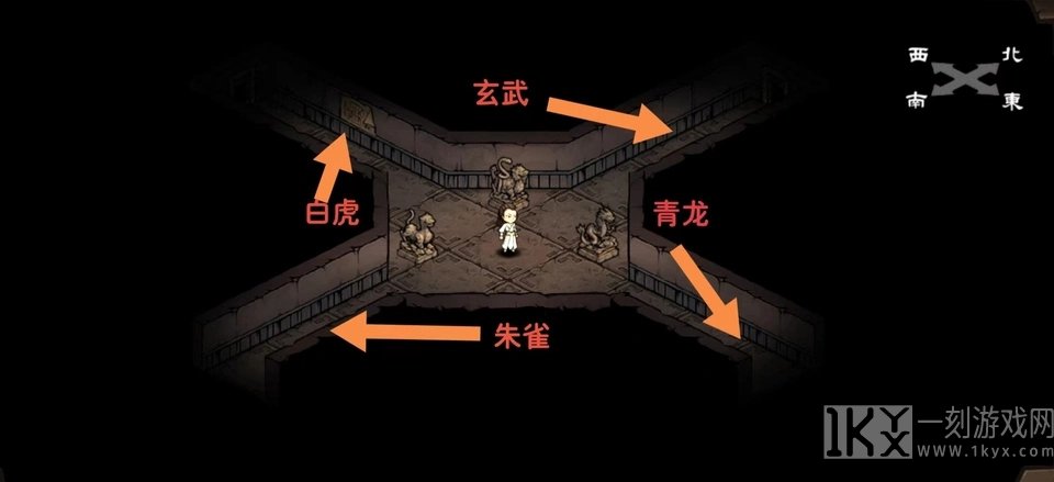 东白龙,西白虎星,南玄武,北玄武岩,街口会出现四座塑像里的三座,看缺乏哪座塑像就跑什么方向。