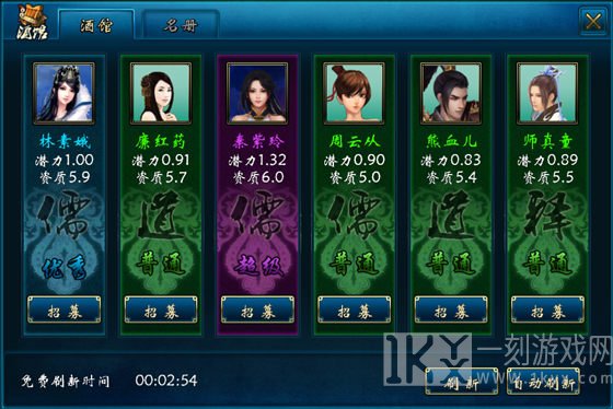 在征募页面左下角有一个完全免费刷新时长,每1个小时有1次免费刷新名将的好机会。当完全免费时长,不要犹豫就拿他了。酒楼里每一次刷新出6名任意名将。当完全免费时间没有到时候,也可以用仙石或是礼品卡刷新酒楼。一般手动式刷新两天就能出深蓝色质量以上散仙,全自动刷新可以考虑名将的质量,及其较大刷新频次。细看散仙的“发展潜力”和“资质证书”,这也是确定散仙高低的重要体现