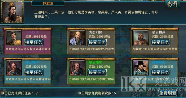 玩家每天都可以进行5次师门,那也是玩家获得工作经验的方式之一,玩家能免费刷新5次来挑选工作经验比较多的那一个每日任务