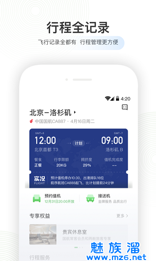 1、飞行记录这里都有,行程管理方法更加的方便,方便你随时进行查询2、一键便捷的预定办理值机,还能够提早设置接送机服务3、可续剖析报预警信息,飞机航班全部的起降情况耽误信息第一时间知道4、坐位提早选,选座再也不用去银行柜台,快速地过关过安检,节约自己的时间5、霸气狂拽酷炫历史飞行轨迹,把你的航行历史时间连成线,微信朋友圈狂晒一波6、一键设置手机模式,不用待机,飞机场中不无趣,给你开展航行直播实时播报,还能够摆放星空图7、智能化系统的图标迅速的显示你行程进展,包含经纬坐标