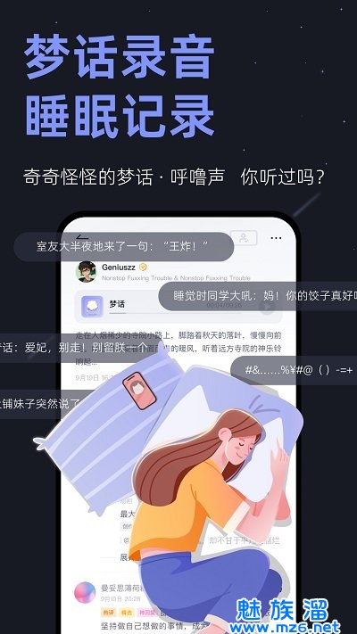 入睡提示、睡眠检测、说梦话音频和睡眠数据统计分析,立体式守卫睡眠。