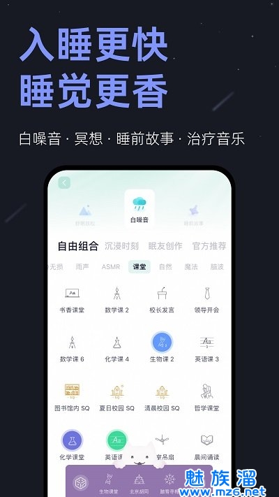 ·完全免费、大量、高质量的白色噪音、ASMR和脑电波声频,构建一个安静、舒心的入眠自然环境,让人更加容易集中注意力,放松身