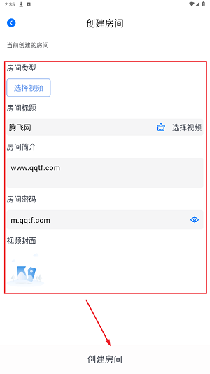 2、在创建房间页面,“选择视频”就是指选择需要一起观看的动漫,屋子介绍账号和密码可以根据个人喜好设定,结束后再次点击“创建房间”。