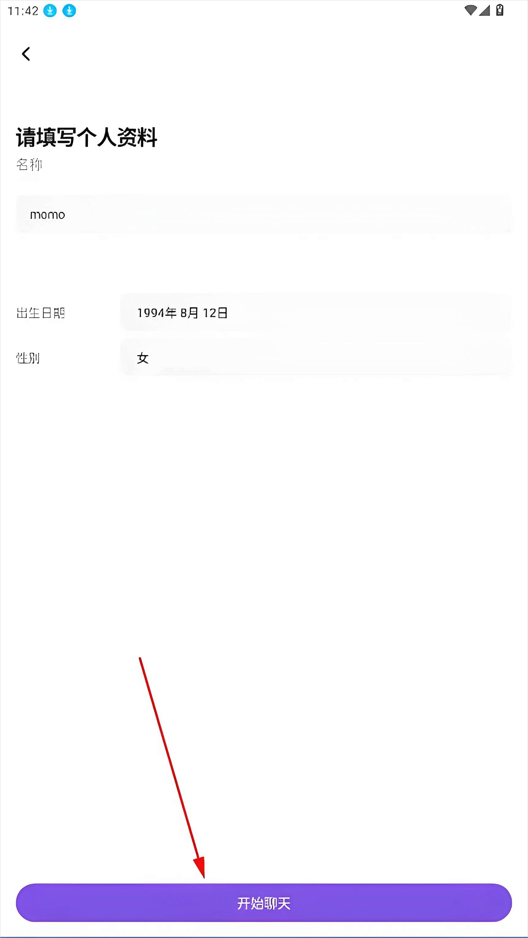 1、注册帐号以后,请填写你个人资料,点击底部逐渐聊天。
