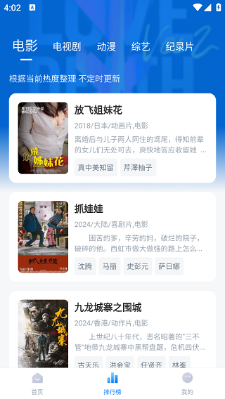 4、點擊菜單欄下方“排行”板塊,這裏有很大的资源排行管理方法,有利于用戶輕松掌握當前熱門的電影、電視劇、動畫等。